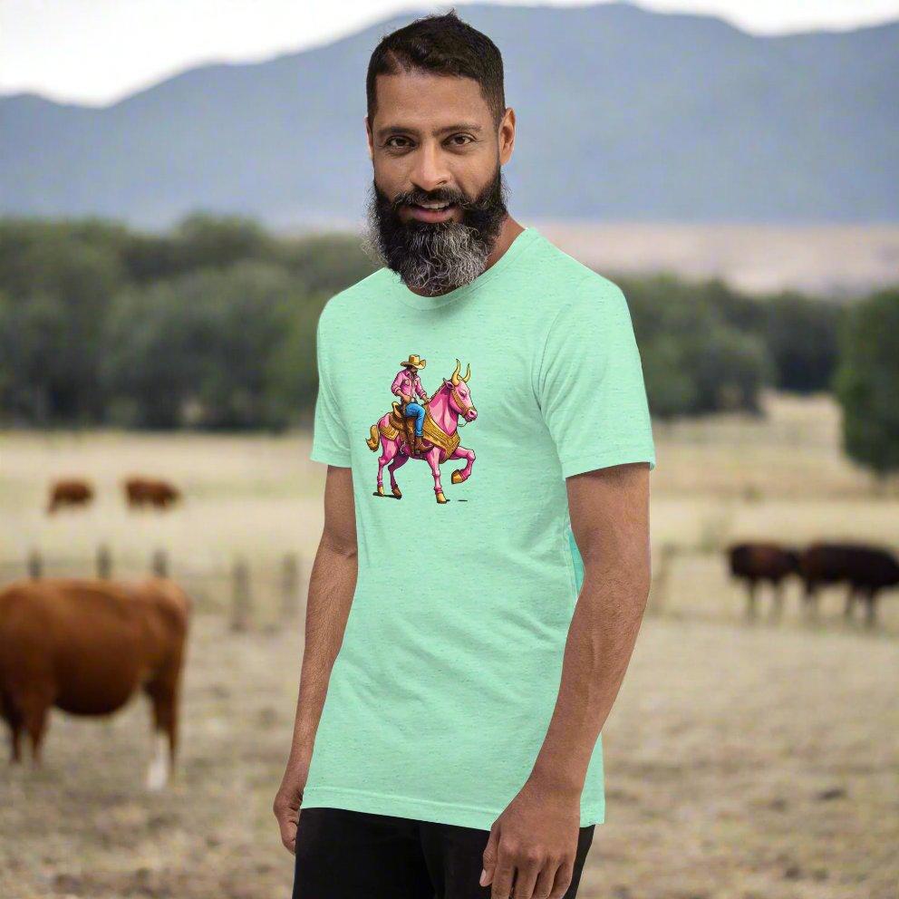 Cowboy riding a pink bull. Unisex t-shirt