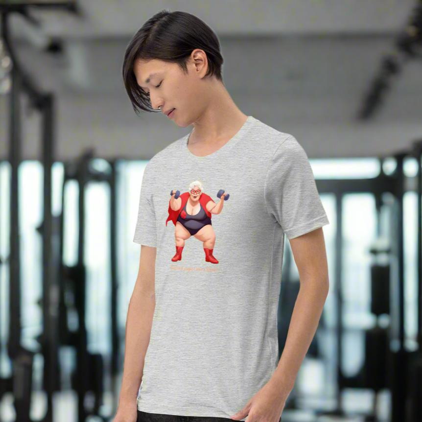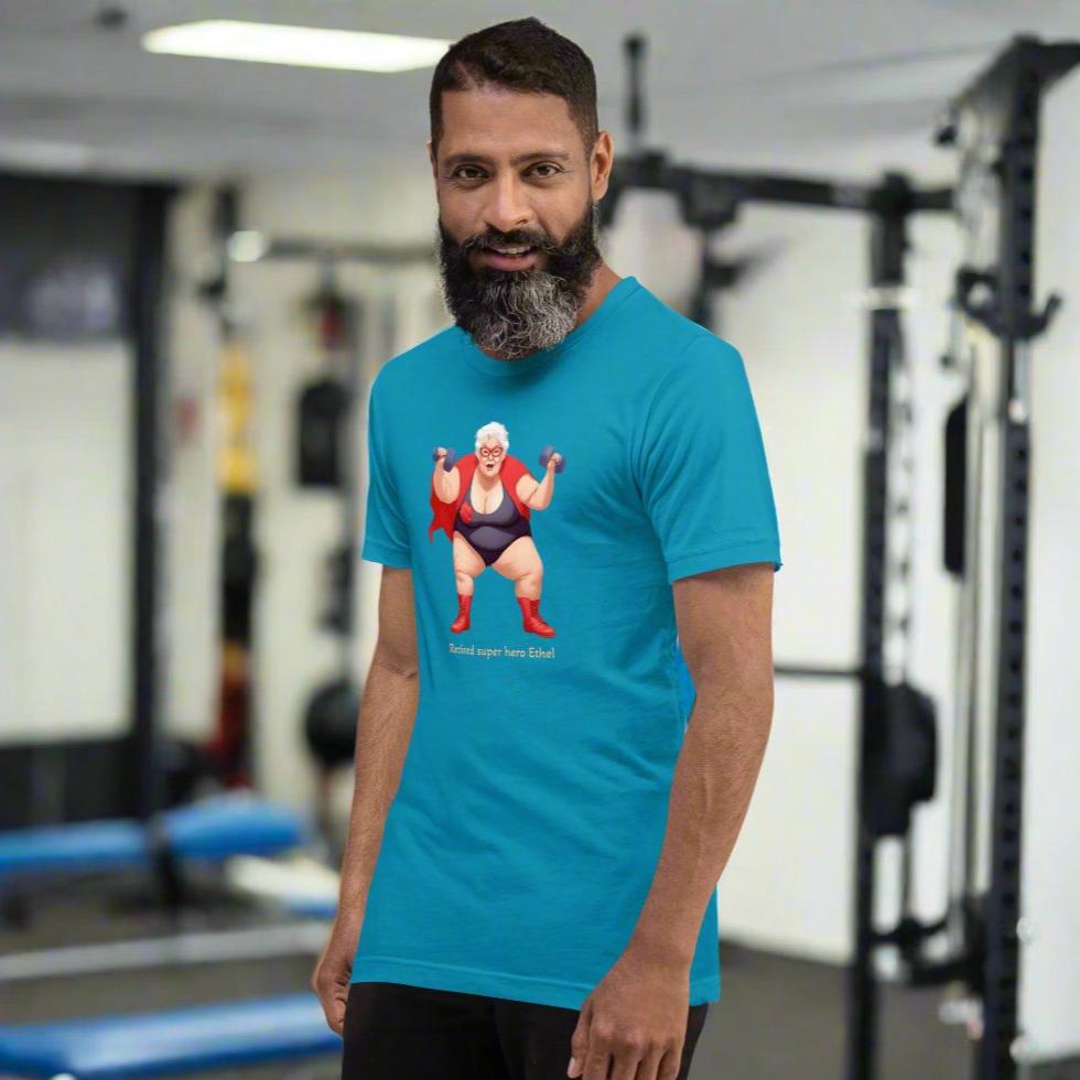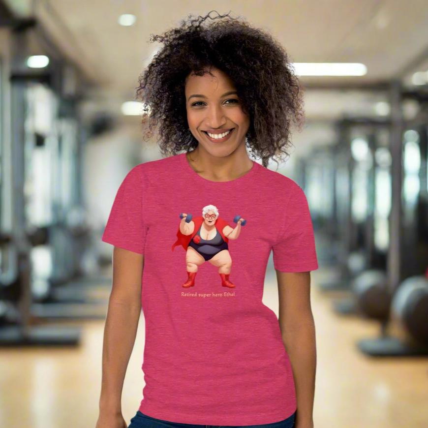 Ethel was never supposed to be a super hero. She found her talent when she discovered her baking was so bad that everything was like a hockey puck. Rock hard. Once as she was throwing out the latest patch of inedibly hard pies one took off like a discus and cut down a tree. Ethel joined the other super heroes and cut the bad guys down to size. Thinking of size: This soft and slightly stretchy T-Shirt feels super comfy and looks good on almost everyone.