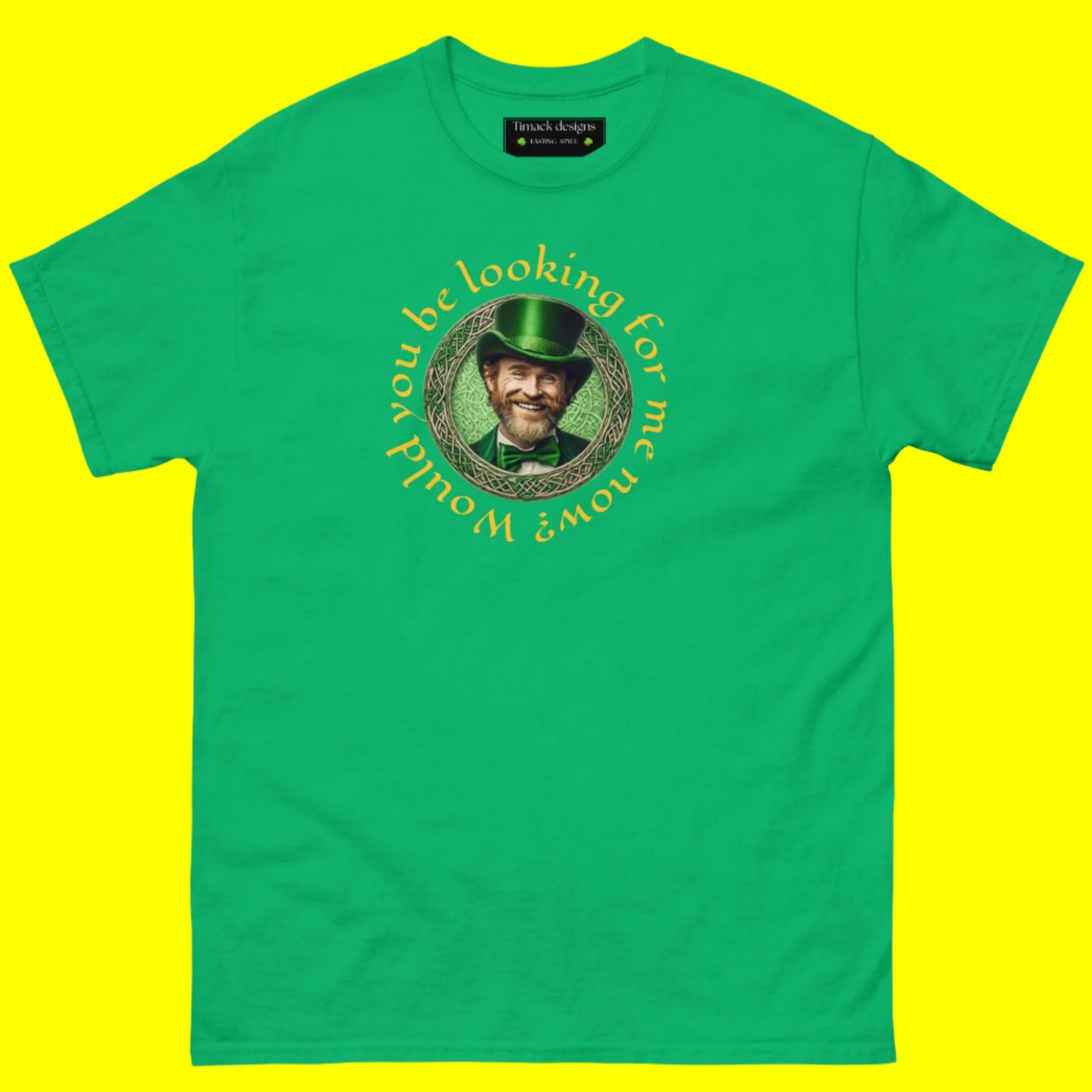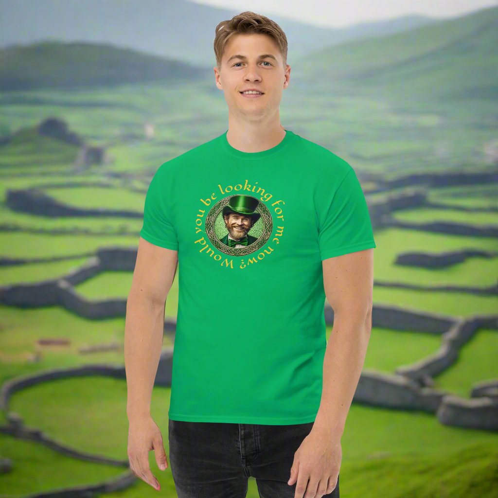100% cotton this unisex classic T-shirt gives you a fun way to say Happy St Patrick's day with a cheeky leprechaun. "Would you be looking for me now?' well sure you would, where there's a leprechaun there is gold!