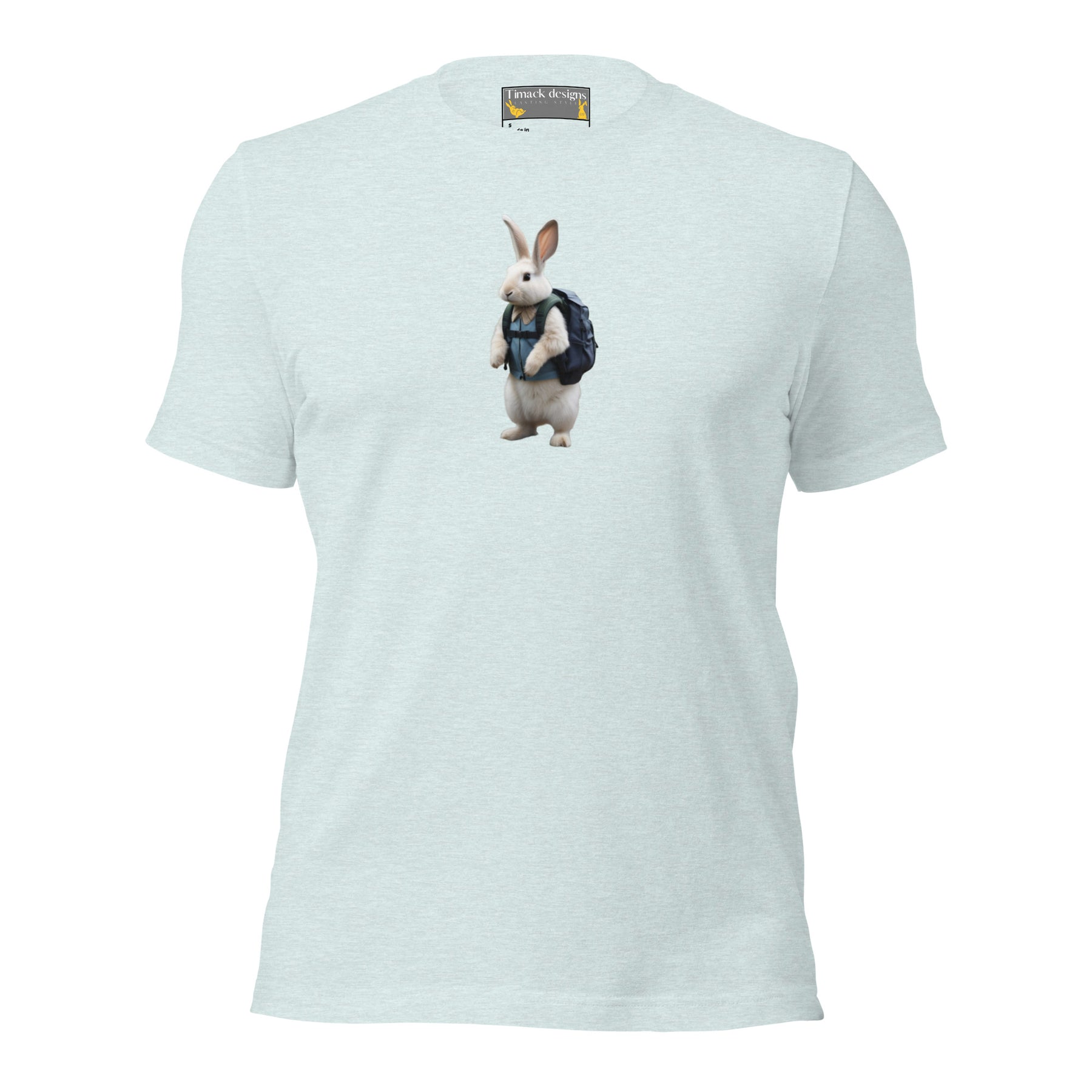 A cute and inoffensive bunny with a back pack. What's not to love? Its made of cotton, although the heather ice has some polyester. lightweight and comfortable it will be a go to item in no time.